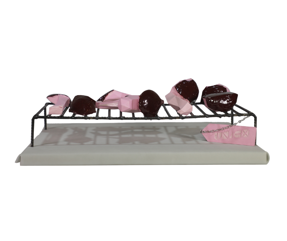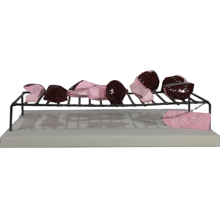 Descuartizado cual asado del domingo. De este modo, Noelia Correa utiliza una tradición tan argentina como es el consumo de carne como metáfora para referirse a los travesticidios y transfemicidios* que suceden todos los días en nuestro país y la región. Este unicornio representa algo tan argentino como la violencia que mata y deglute los cuerpos y las almas. Así, la tradición nos reúne al calor de las brasas, donde el fuego es el único que ilumina las verdades y consume todo resto.